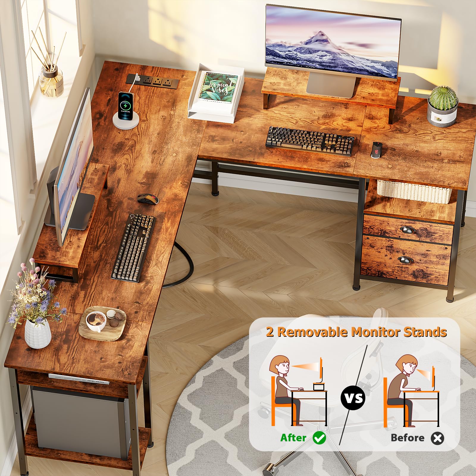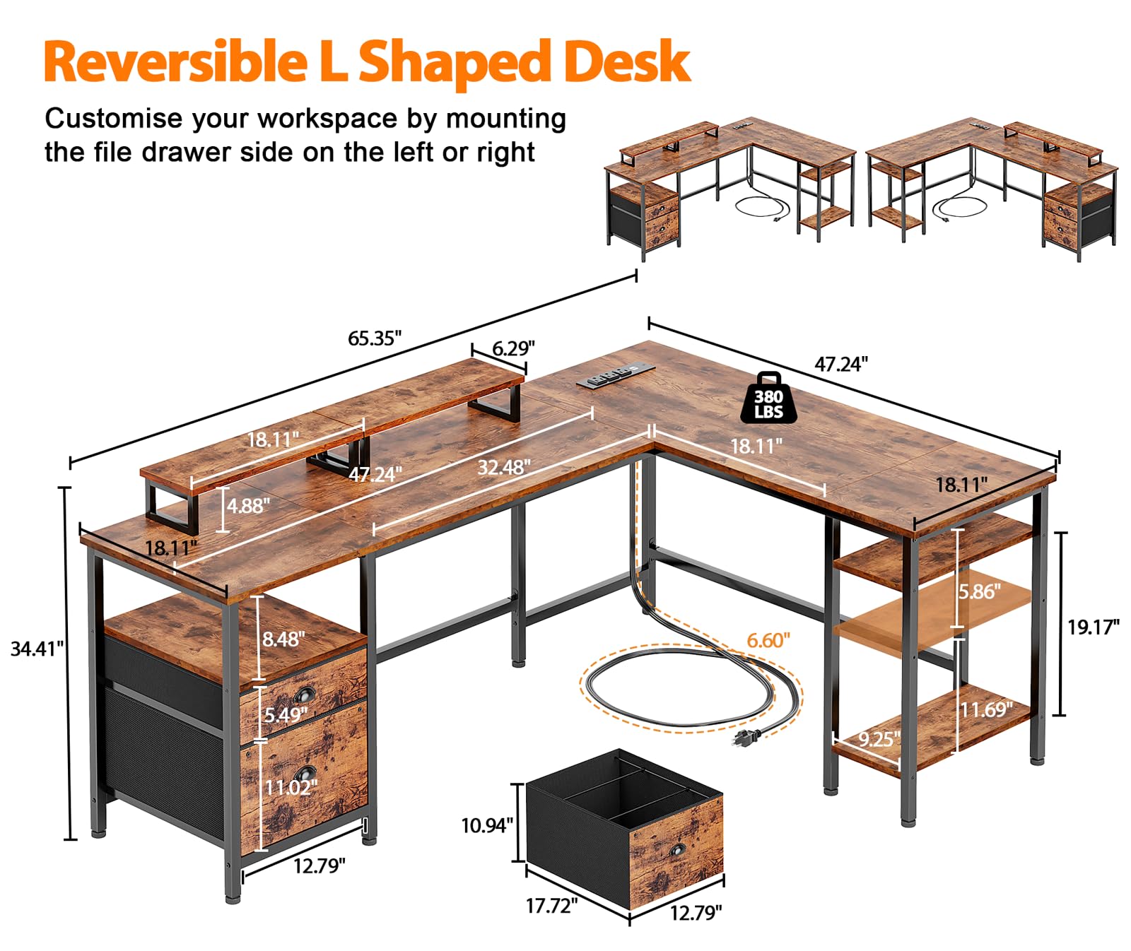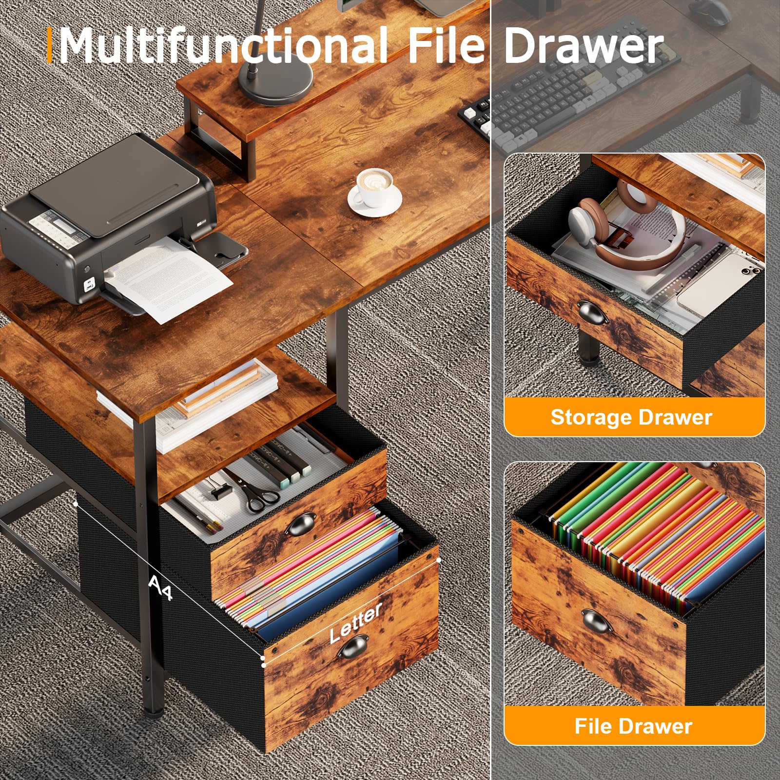 - Upgraded Fabric File Drawer: The l shaped desk with a fabric drawer and file cabinet, 2 tier storage shelves, allowing you hold letter/A4/ legal size files. Drawers made of high-quality non-woven fabric that is lightweight, breathable and prevent dust.