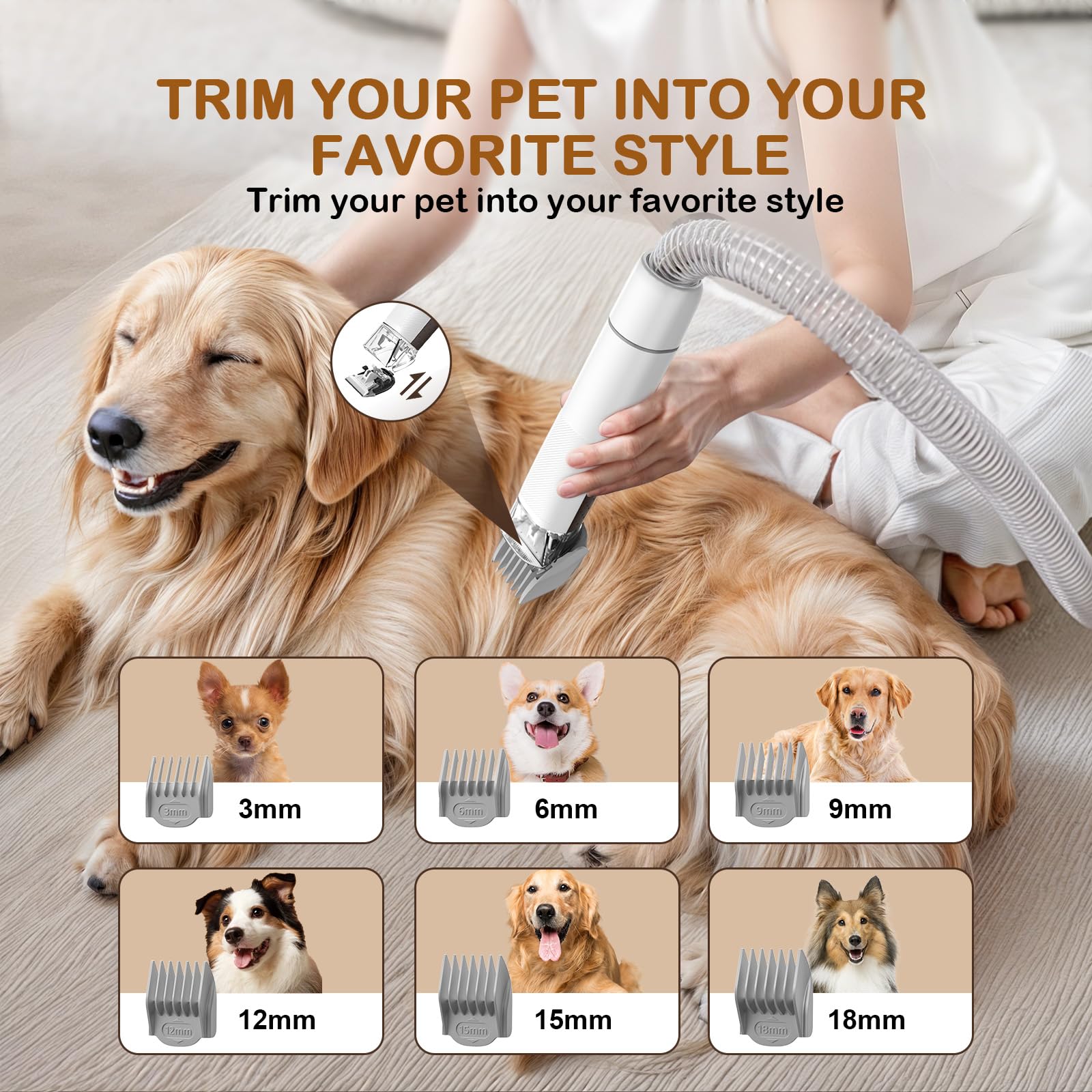 • 🐕6 Adjustable Guard Combs: With combs ranging from (3mm/6mm/9mm/12mm/15mm/18mm), you can easily trim pet hair of different lengths. The detachable guide combs allow for quick changes, offering versatility for tailored grooming results.